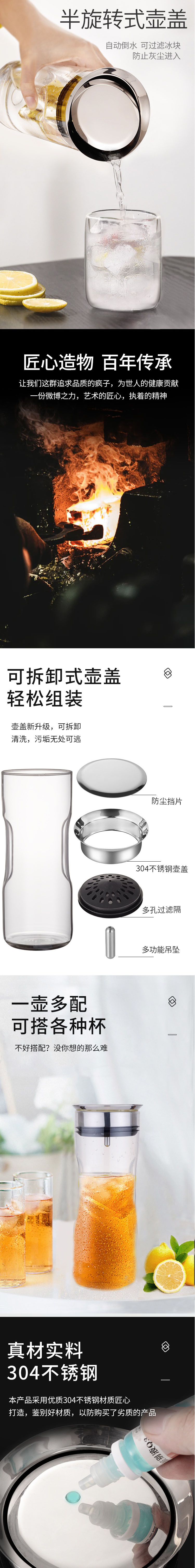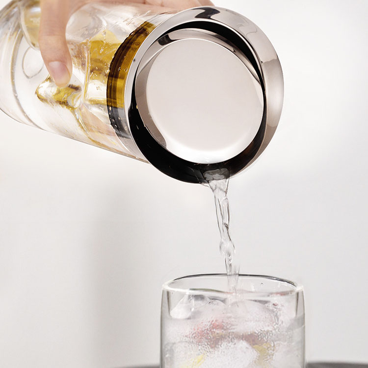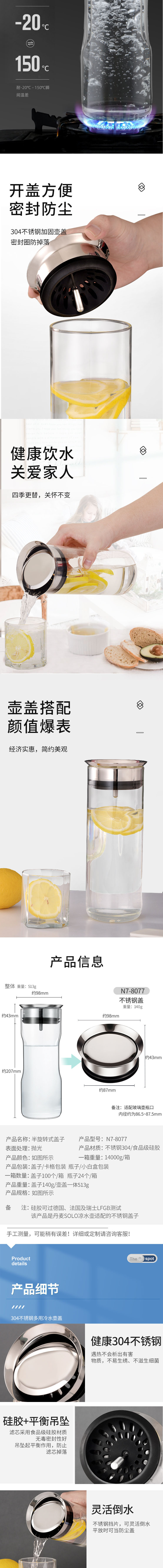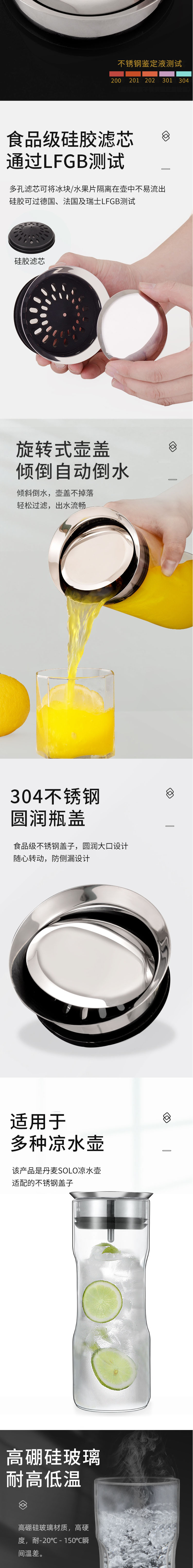 傾倒自動(dòng)倒水,傾斜倒水,壺蓋不掉落,輕松過濾,出水流暢。304不銹鋼圓潤瓶蓋:不銹鋼蓋子,圓潤大口設(shè)計(jì),隨心轉(zhuǎn)動(dòng),防側(cè)漏設(shè)計(jì)。適用于多種涼水壺,該產(chǎn)品是SOLO涼水壺,適配的不銹鋼蓋子。高硼硅玻璃,耐高低溫,高硼硅玻璃材質(zhì),高硬度,耐-20°C- 150°C瞬間溫差。開蓋方便,密封防塵,304不銹鋼加固壺蓋,密封圈防掉落。304不銹鋼,遇熱不會(huì)析出有害物質(zhì),不易生繡、不滋生。硅膠+平衡吊墜,濾芯采用硅膠材質(zhì),密封性好。吊墜起平衡作用,防止濾芯掉落。靈活倒水,不銹鋼擋片,可靈活倒水,平放時(shí)可當(dāng)防塵蓋。